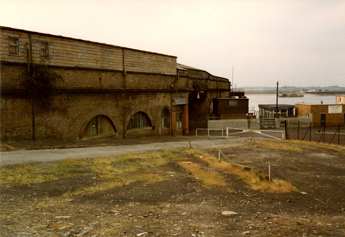 When this picture was taken in July 1984, Gravesend West station was largely complete; only the track was missing. This is a northward view towards the Thames, and shows the original valance still intact, if not somewhat forlorn, and the platform rising out of the vegetation. On the far left in the background, marked by the white board, is the former entrance to a covered walkway, built during World War I for passengers to use when moving by foot between train and ferry. © Mike Glasspool