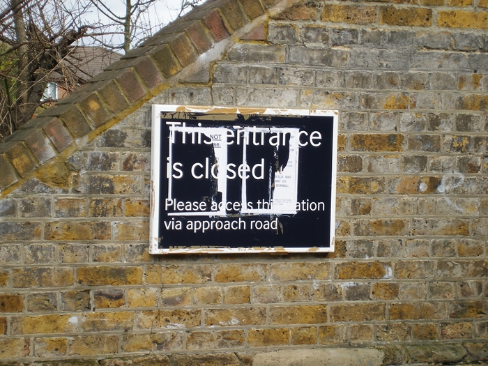 Confirmation that the old buildings were doomed was given by this prematurely exposed sign, which indicates that the original station entrance via the SER steps is to be permanently closed, and all traffic handled at the new building. © David Glasspool