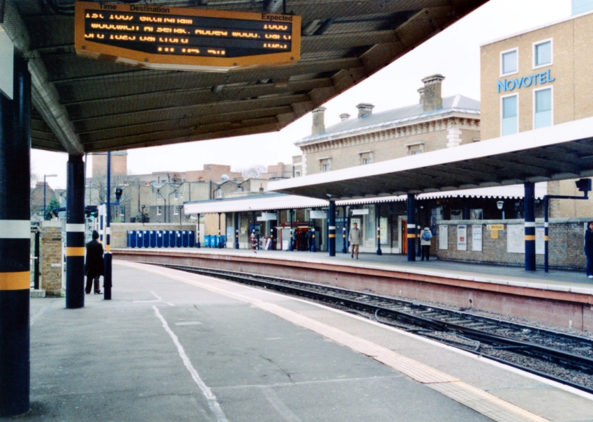 A similar viewpoint to the previous photograph, but now in the 21st Century, shows a lot of changes. As part of the DLR works, the gap in-between the lines has gone, the "up" track shifted towards the camera, and the London-bound platform extended from the main building to meet it. V-shaped canopies are now present on both sides and the wall on the right, behind the "up" platform, hides the descent of the DLR into a tunnel. The hotel immediately adjacent to the main building dates from 2005. © David Glasspool