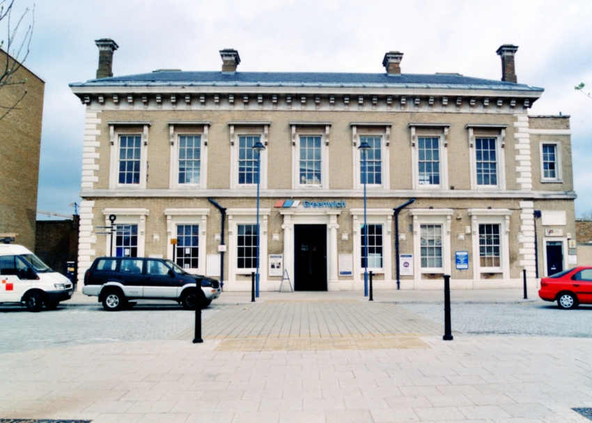 The fine station building, restored in 1988, was still displaying a "Network SouthEast" logo above its main entrance, over a decade after the British Rail business sector's demise. The platforms and tracks of the previous station, replaced in 1878, stood in the foreground, upon what is now the forecourt, and the building pictured was end-on to the rails, as per a typical terminus. The structure was then dismantled brick-by-brick and re-erected beside realigned running lines, which now allowed through running to Charlton. The book referenced much in the main text, "The First Railway in London" [1912], whose author Alfred Rosling Bennett remembers both the pre- and post-1878 Greenwich branch first-hand, states that the main building - save for internal layout - was rebuilt in identical style. Therefore, the building we see today is the same as that opened in 1840, albeit rotated 90 degrees and moved a little further north. However, some lithographs of the 1840 station show the main building to have been shorter than today's, and with a flat rather than hipped roof. © David Glasspool