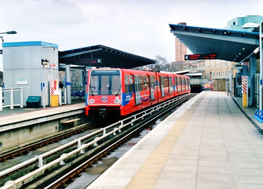 A "B92" four-car automatic electric DLR unit, No. 60. is seen starting the descent into the cut-and-cover tunnel which takes the line through to Cutty Sark. Thereafter, it dives down even further under the Thames to reach the Isle of Dogs. These tracks reside on the former site of the original "up" platform of the National Rail station; the main building can be seen above the tunnel portal in the background. © David Glasspool