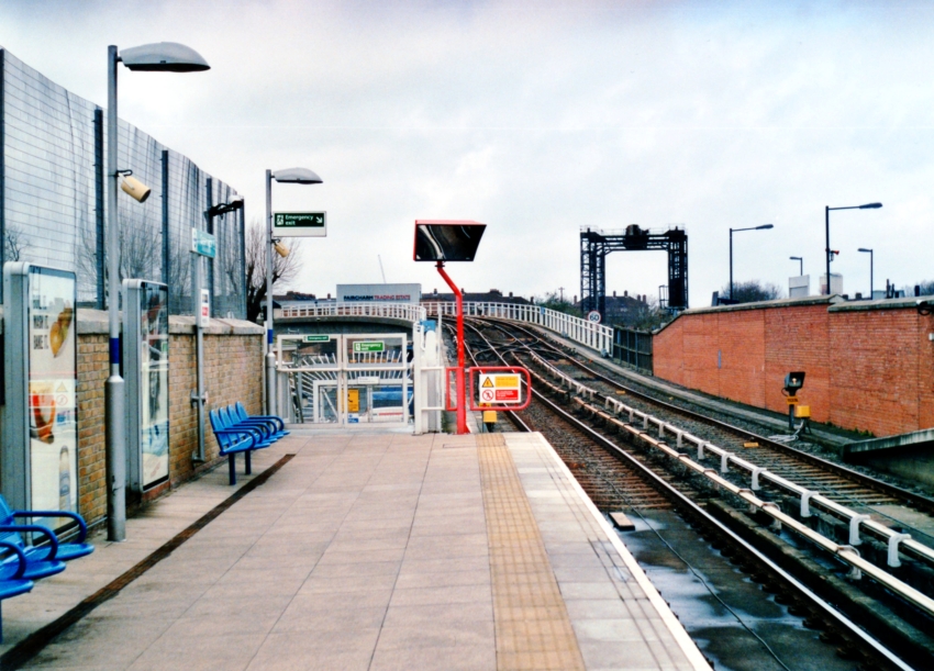 Looking towards Deptford, the replacement "up" platform is in view; the two canopies in the right background are those for the DLR tracks, the latter of which descended towards a tunnel behind the wall. © David Glasspool