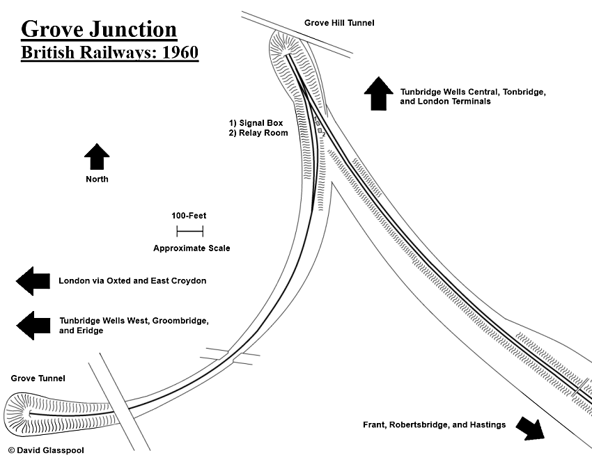 The 16-lever signal box seen in the photograph below came into use at Grove Junction on 15th October 1932, having replaced a timber cabin of SER origin (ref: Volume 4: Southern Railway Register, Section B2: Tonbridge to Hastings, Signalling Record Society). The single line between Tunbridge Wells West “B” signal box and Grove Junction was worked by the train staff and ticketing system, and fell at a gradient of 1 in 80 away from the Hastings main line (ref: The Railway Magazine, January 1956). On the introduction of the summer 1956 timetable, the single-track in-between Grove Junction and Tunbridge Wells West was scheduled to have fifty-eight passenger trains running over it daily, which included an hourly service between Tonbridge and Brighton via Uckfield (ref: The Railway Magazine, June 1956).