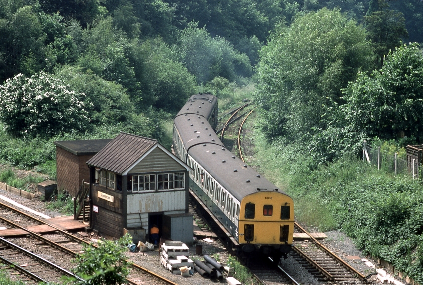 Two days prior to the cessation of passenger services to/from Tunbridge Wells West, Class 207 DEMU No. 1308 is seen passing the signal box at Grove Junction, bound for that station. Evident are materials to be used in connection with electrification between Tonbridge and Hastings. At this time, the pictured section of the "up" main line was temporarily out of use, and the connection between it and the branch to West station had been taken out. © David Glasspool Collection