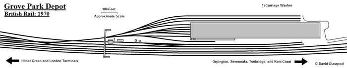 Track plan of Grove Park Depot as of 1970. Click the above for a larger version. © David Glasspool