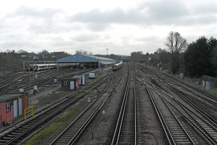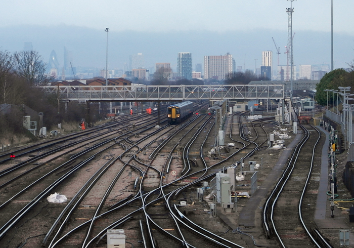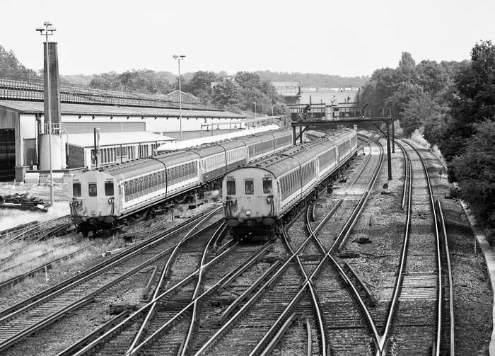 The four-track "Tonbridge Cut-Off" main line is on the right of this Orpington-bound view. The double-slip has been a feature of the depot since the earliest days. The automatic carriage washing apparatus was formerly positioned just out of view, to the bottom left, but was moved 720-yards towards London on the commissioning of the additional berthing sidings on the site of Hither Green Marshalling Yard. © David Glasspool