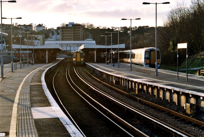 to St Leonards Warrior Square, where the light of a train can be picked out. The fenced off area on the left, just