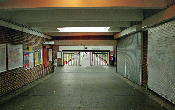 Of the three shop fronts to the left of the station entrance, the two furthest away were completely destroyed by bombing in September 1940 and subsequently rebuilt. Reconstruction was finished over a decade after the end of World War II, which included a simplified entrance facade, seen here. © David Glasspool