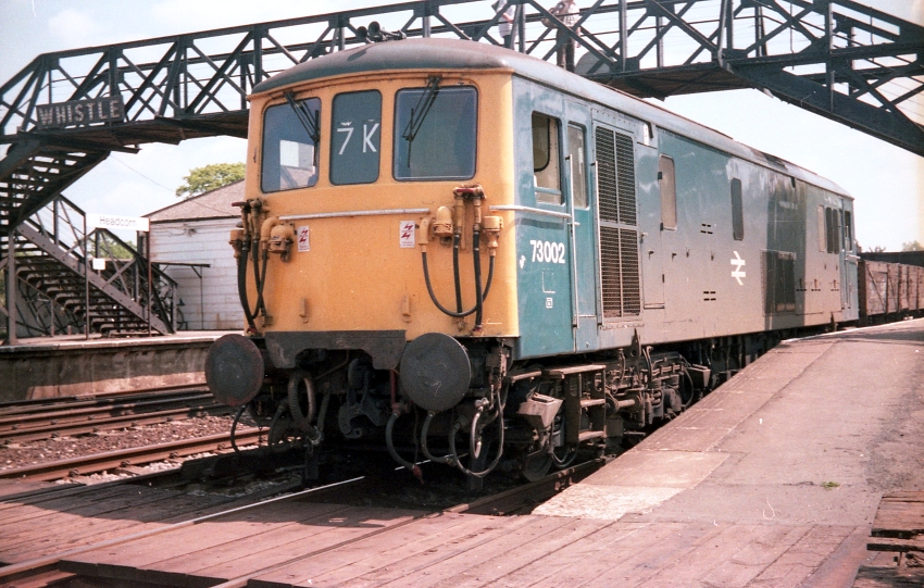 Approaching Headcorn from the west with a non-stop Dover express is Rebuilt West Country Class No. 34012 "Launceston". Behind can be seen what appears to be a Maunsell "N" Class shunting in the goods yard. The yard's crane, good shed, and shunt signal are all in view. Inevitably, this site became the station car park after withdrawal of goods traffic. Conductor rails are already in place for electrification and the evident semaphore signal was soon to go. © David Glasspool Collection