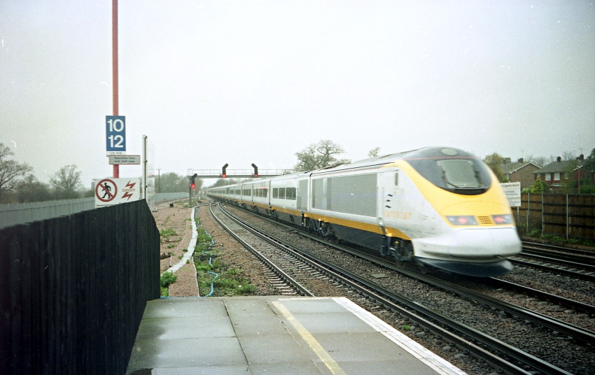 A Class 373 formation is seen heading London-bound in late 1994, at the western end of the station. On the left is the then recently-completed "up" Chunnel freight loop; the timber fence on the far right separated the railway from the station's car park. © David Glasspool Collection