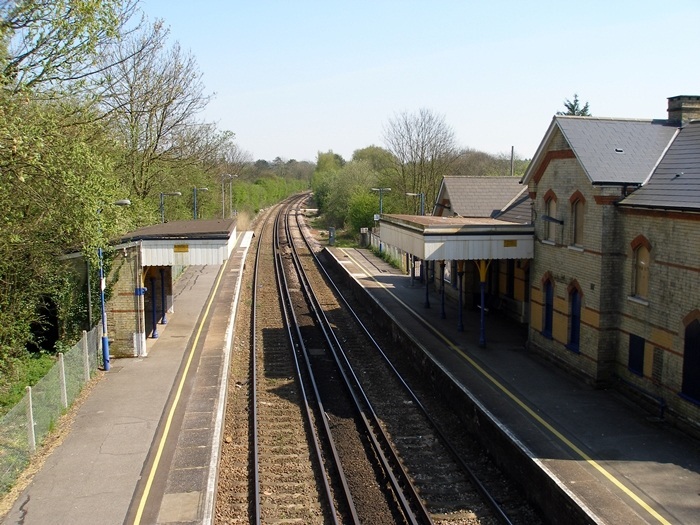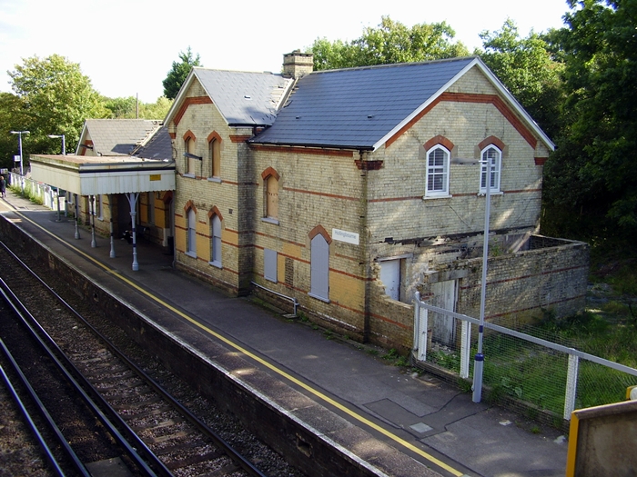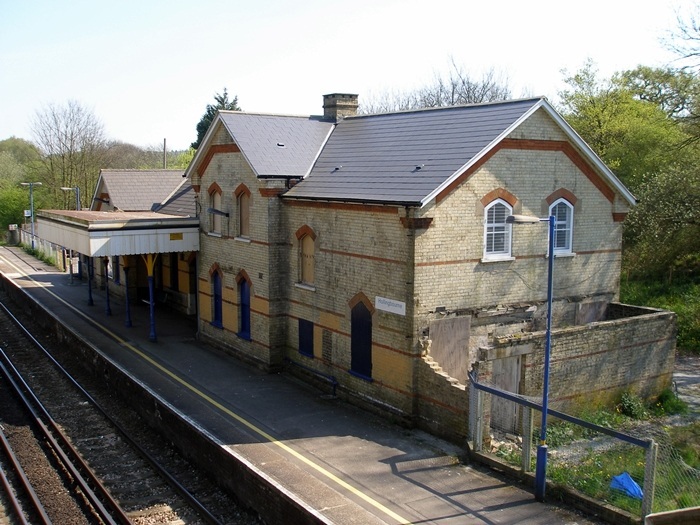 A final eastward view better illustrates the charming ''down'' side waiting shelter, with simplified canopy valance. In common with the other stations along the route, the waiting shelter has seen its window frames bricked up. The wooded area on the right, just beyond the platform, is the former site of the 1961-closed goods yard. © David Glasspool