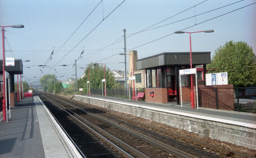 Opening of the station at Homerton coincided with the commencement of electric passenger services over the stretch of line between North Woolwich and Dalston Junction, on 13th May 1985. This was on the 750 Volts D.C. third rail system, making an electrified semi-circle from North Woolwich to Richmond. Two platforms of concrete block construction, approximately 210-feet in length, were built upon the former site of the 1868 station, each of which was reached by an inclined walkway from street level below. The architecture was as per those stations at Hackney Wick and Hackney Central, albeit on a smaller scale. Each platform was host to a rectangular waiting shelter which comprised a red brick base and rear, with glazing on three sides. A square overhanging roof, with a plain corrugated valance, was a feature of both shelters – indeed, the design was somewhat reminiscent of Birmingham New Street signal box. At street level, on the southern side of the line, a single-storey red brick ticket hall was built; the downward-sloping roof of this had the same corrugated metal effect as the valances of the waiting shelters.