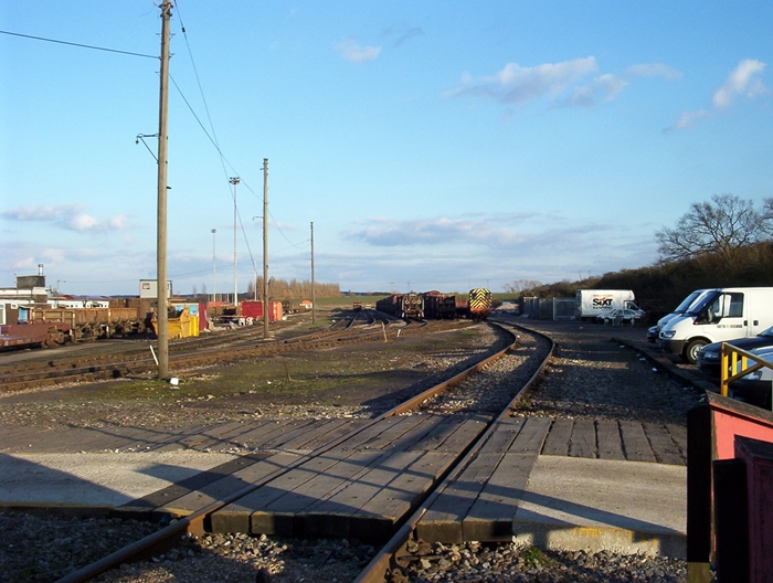 An eastward view from the ''London'' end of the ''up'' yard shows a pair of headshunts in the foreground. That on the left was occupied by the ''EWS locomotive line-up'' in the 1999 picture on the previous page. © David Glasspool