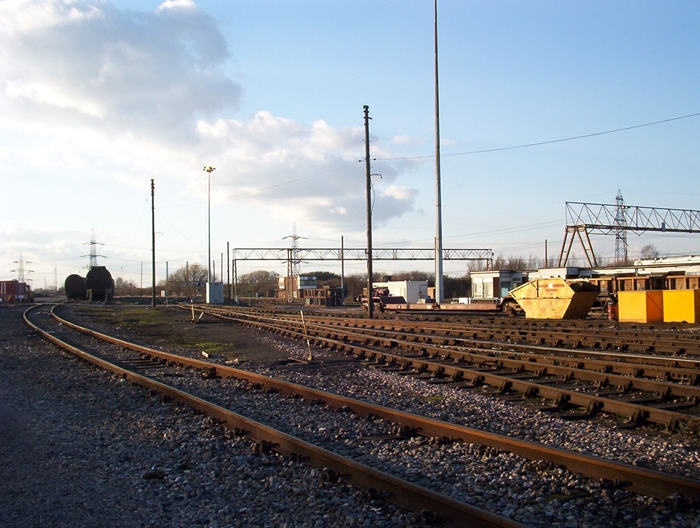 Manual point levers are in evidence in this westward view of the ''up'' yard. The curved track in the foreground eventually terminates in ''B'' Shunt Neck - this is one of the two headshunts seen in the eastward view on the previous page. © David Glasspool