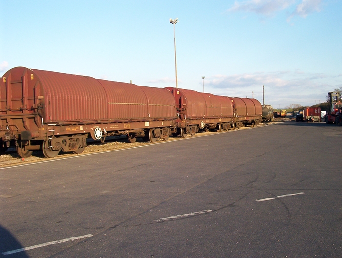 A grubby trio of EWS' 102 tonne BRA steel strip carriers are seen stabled in the ''up'' yard. These wagons were built by Thrall, York, in 1999, to convey steel strip under cover, to protect it from the elements. © David Glasspool