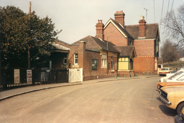 The main station building was adorned with Southern Railway colours when viewed in 1986. The vertically-hung clay tiling covering the upper storey dates from around 1910; that tiling within the pitched roof sections has been in existence since the station's opening in 1882. © Mike Glasspool