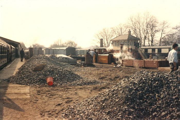 Our old friend, No. 55 ''Stepney'', is seen stabled upon the dock line at the southern end of the station, alongside what had become the coal dump. The exposed carriage works sidings on the left finally received cover in 2000, on the completion of a timber extension in September of that year. © Mike Glasspool