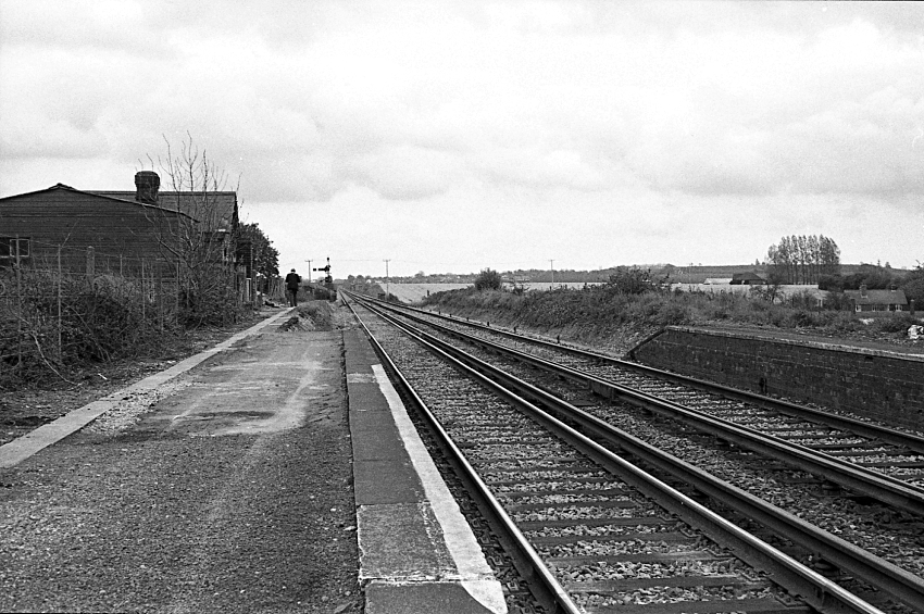 An Ashford-bound view shows the remains of the "down" side main building, which by that time just comprised of the single-storey pitched roof section common to all intermediate stations along the 1884 route. By this time, the "up" platform, on the right, had been cut back to about a quarter of its original length and similar demolition of the "down" platform was well advanced in this photograph. It was not long before the site was absorbed into an aggregate terminal and all remains lost. The conductor rails dated from electrification in 1961, the first electric services running to existing steam timings from 9th October of that year. © David Glasspool Collection