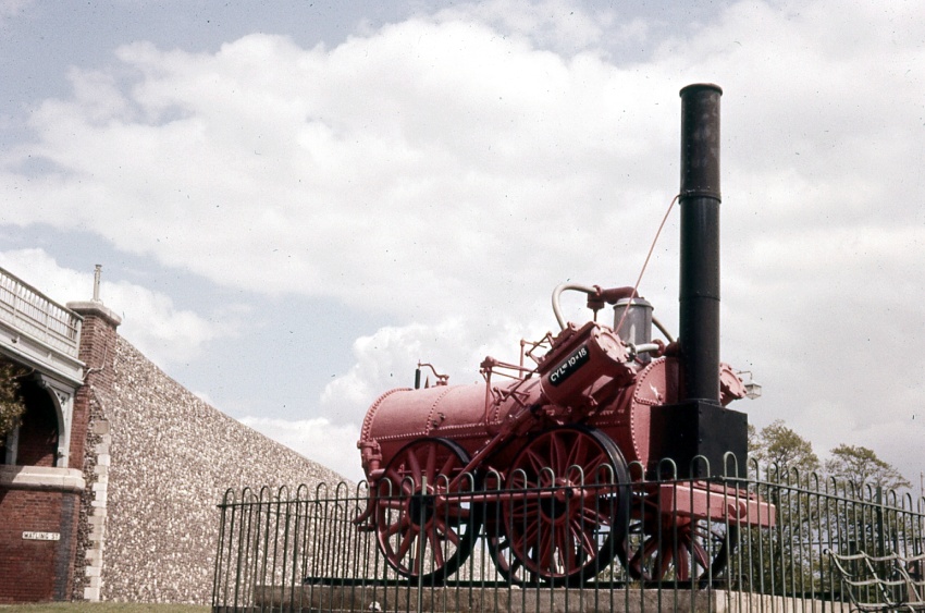 The red paint had perhaps faded slightly, but "Invicta" looks in good cosmetic condition in this 1962 view, showing the form it took after rebuilding in 1838. The locomotive is seen on the original plot of land where it had been displayed since being presented to the city in 1906, at "Riding Gate", about 350-yards northeast of East railway station. As a result of road widening, "Invicta" was moved to a new railing-lined enclosure in 1968, all of 70-yards to the northwest in Dane John Gardens, on the opposite side of the City Wall. © David Glasspool Collection