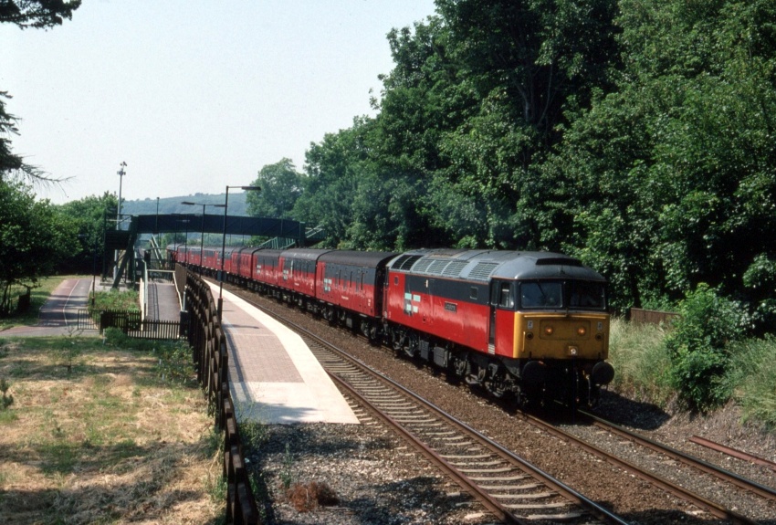 Class 47 No. 47789 is seen passing through the then new Ivybridge station eastbound, hauling the 13:53 Plymouth to Crewe mail. The car park is out of view, to the left. © David Glasspool Collection