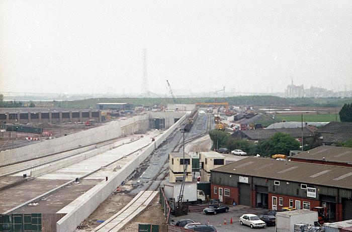 A view looking northwest shows the completed approaches to the Thames Tunnels, immediately before track laying. Kent Portal Yard can seen on the right-hand side of these. © David Glasspool