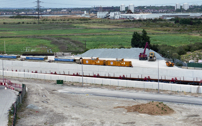 This was a fairly sizeable ensemble of sidings, situated on the eastern side of the Thames Tunnels' southern portals, about ⅔-mile northwest of the Ebbsfleet International station construction site. The yard's primary role was to harbour those infrastructure trains used in connection with track laying at Ebbsfleet. This formally commenced on 10th May 2004, the first of these rails being laid on the elevated spur which would eventually connect the CTRL (High Speed 1) with the North Kent Line.