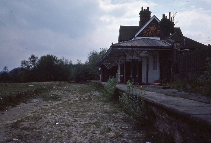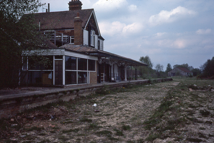 Looking in the East Grinstead direction in 1980, we can see that the "down" platform (right) was nothing more than a dishevelled mound of earth, but the former goods shed, in the background, had remained standing all this time. The main station building on the "up" side had kept its canopy, but gained a typically 1970s-design extension. A timber outdoor terrace had also been installed behind the canopy. © David Glasspool Collection