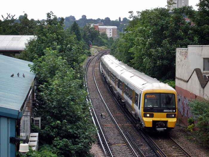 Class 465 No. 465043 is seen approaching Ladywell. In the background, curving off to the left, is the ''Ladywell