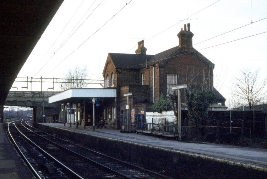 The main building — which survives today — is a substantial red brick structure located on the "down" platform (No. 3). Variations of the same design came into use at the likes of Upminster, Ockenden and West Hordon. These buildings are so similar in design to those at intermediate stops between Maidstone East and Ashford in Kent — right down to the canopy stanchions and brackets — that they must all surely be the products of the same architect. In this London-bound view from the island can be seen a still extant track foot crossing for staff and, beyond the foot and road bridges, the connection between the tracks serving platforms 1 and 2. © David Glasspool Collection