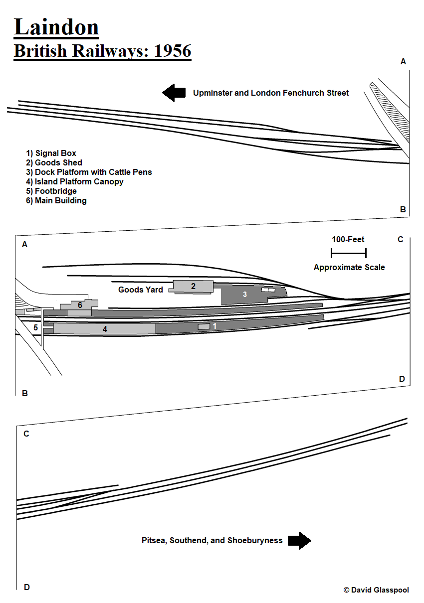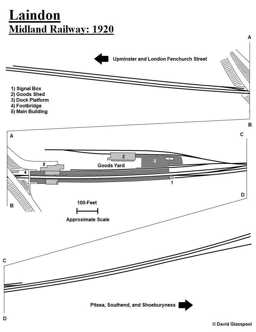The early layout at Laindon is depicted in the diagram below. It is evident that a spacious goods yard existed on the "down" side of the line, within which sidings served cattle pens and a goods shed. The latter was a substantial brick-built structure, with a canopy extending from its southern elevation, and a single track passed through. The layout was controlled from a neat two-storey-high signal box, built of brick and with a hipped slated roof, positioned at the eastern end of the "up" platform.
