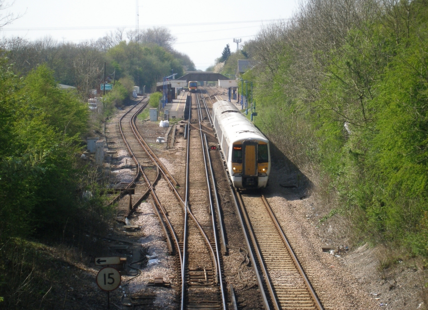 A London-bound view shows "Electrostar" No. 375611 departing Lenham with a coast-bound working whilst, in the distance, can be seen a Class 465/9 on a working to London Victoria. On the left is the "up" side electrified passing loop, which is routed through the former goods yard site. The goods yard area also extended beyond the vegetation alongside the loop and although the goods shed had been demolished, the yard's office was still standing. The latter is marked by the turquoise sign. © David Glasspool