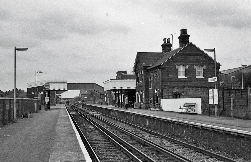 Apart from the replacement of name boards, little changed at this station under Southern Railway ownership; major layout alterations were left to British Railways. Of particular relevance to Lenham was the Kent Coast Electrification Scheme, which called for a revised arrangement to cater for the impending accelerated electric timetable. As part of the scheme’s ‘’Phase 2’’, the opportunity was taken to install Exmouth Junction-produced prefabricated concrete footbridges at all stations east of Maidstone throughout 1961. During this year, electrified passing loops for fast services were also installed at Lenham: that on the ‘’up’’ side was routed behind the platform, through the goods yard, whilst the Ashford-bound loop was positioned beyond the western end of the ‘’down’’ platform. The latter had been created by extending the existing "down" siding here and forming it into a loop – this course of action safeguarded the existence of the dock line. In later years, the electric timetable saw that, on occasions, fast services from Charing Cross and Cannon Street caught up with the stopping trains from Victoria. Therefore, when an ‘’up’’ stopping service was stabled at the platform, a fast service could take priority and overtake it by means of the loop. To control the revised layout, a ‘’power box’’, constructed to the typical brown brick and glass design of all those cabins erected during the Kent Coast Electrification Scheme, appeared alongside the existing Saxby & Farmer signal box. The latter last operated on 22nd July 1961, the ‘’power box’’ coming into use the following day. Despite the presence of the "up" side overtaking loop, goods traffic continued to be handled at Lenham until 6th January 1969.