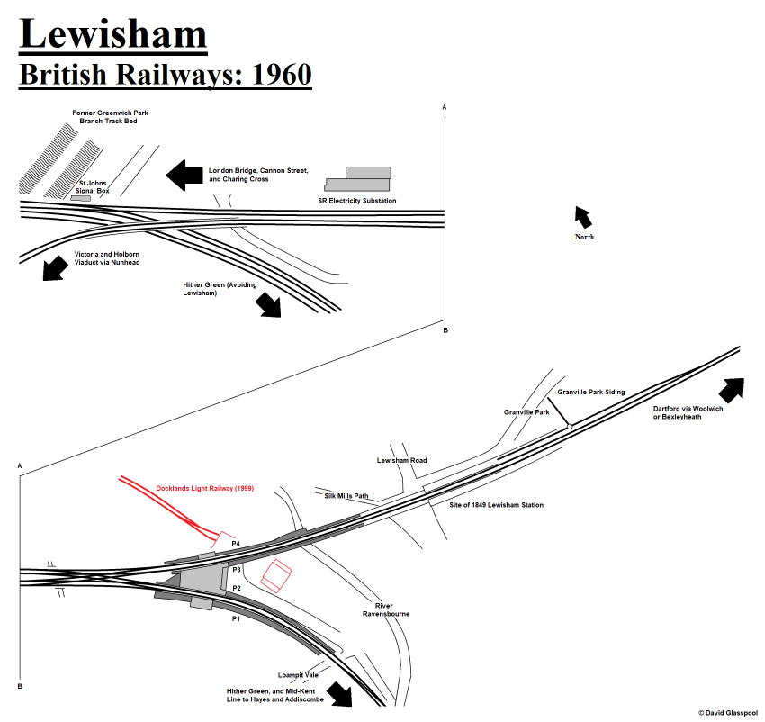 The MKR opened to passenger traffic through to Beckenham on 1st January 1857, being worked by the SER from the outset. Today’s Lewisham station, which came into use on that date, resided about 180-yards west of the original North Kent Line platforms of 1849, on the opposite side of Lewisham Road and the River Ravensbourne.