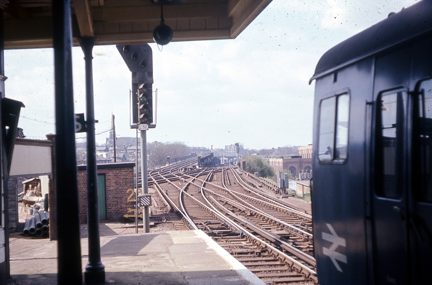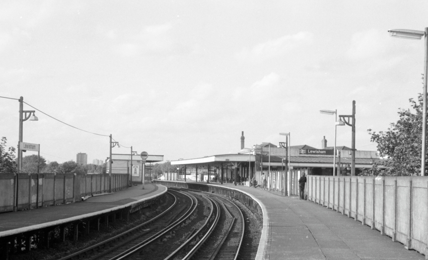 A north westward view at the end of platform 3 towards St Johns shows the complicated track of Lewisham Junction. On the left is the ascending double-track of the line to Nunhead, whilst descending on the right is that to St Johns and terminals at Cannon Street and Charing Cross. To the right of the railway, at a lower level, can be seen the huge Southern Railway electricity substation. Note the former station run-in nameboard on the left, which by that time was blank. © David Glasspool