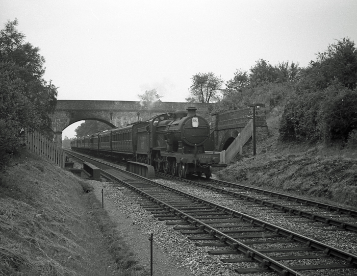 D1 Class No. 1727 is seen heading in the Tonbridge direction with a train which your author suspects has originated from Reading; the train is quite possibly for Margate. The third carriage behind the locomotive seems to be from the Great Western Railway's stock, being in that company's chocolate and cream livery. The bridge behind carries "Hilders Lane", the viewpoint of the first two photographs on this page. © David Glasspool Collection