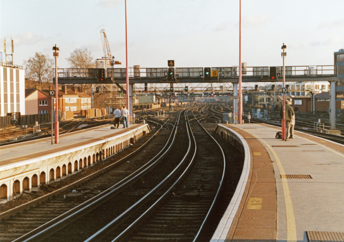The seven parallel "through" tracks of the "high-level" station are seen heading east towards New Cross. Switching between Cannon Street and Charing Cross routes was confined to this end of the station in 1991, after the abolition of Borough Market Junction. © David Glasspool