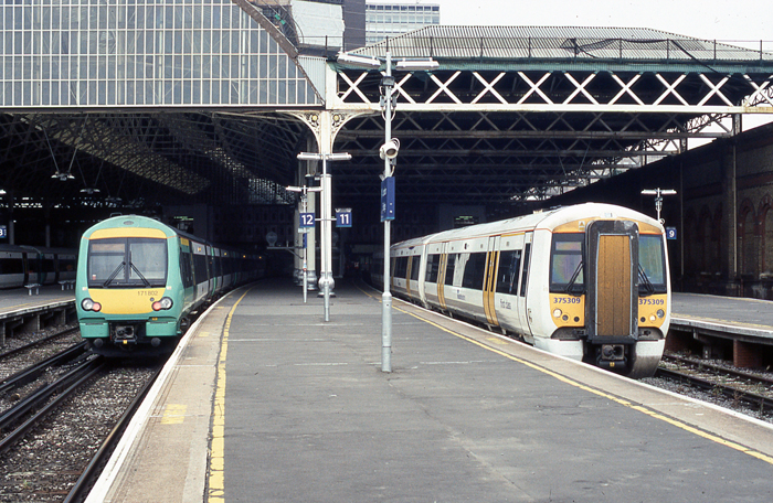 DEMU Class 171 No. 171802 is seen shortly after arrival from Uckfield, whilst three-car "South Eastern Trains" Class 375 No. 375309 departs for Tonbridge via Redhill. © David Glasspool Collection