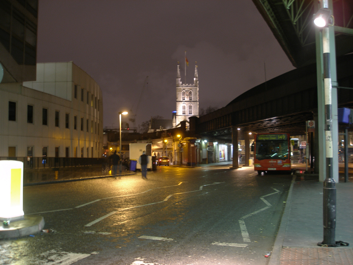A westward view on New Year's Day shows the viaduct which carries the two pairs of tracks for Charing Cross and Cannon Street routes from London Bridge. The tower illuminated in the background is that of Southwark Cathedral. © David Glasspool