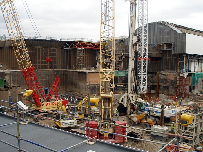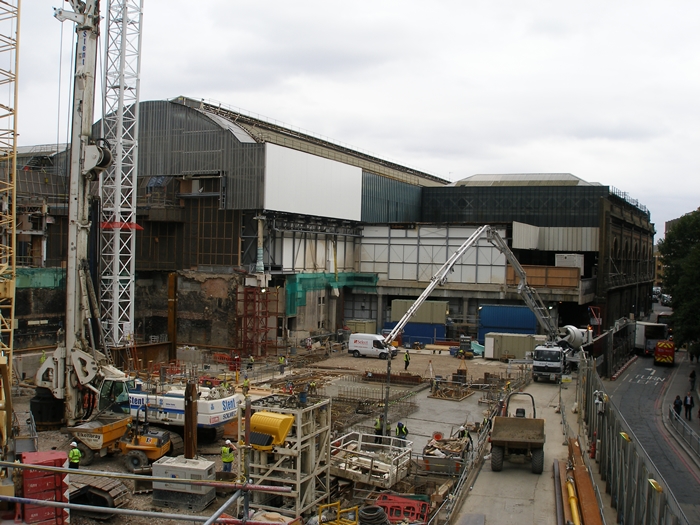 Behind the trainshed, we can see the first foundations being made for ''The Shard''. This view shows to good effect the elevated nature of the platforms and tracks of the terminus station. © David Glasspool