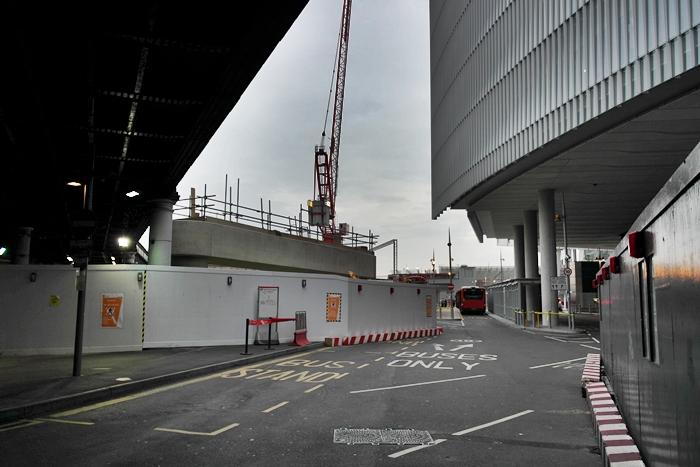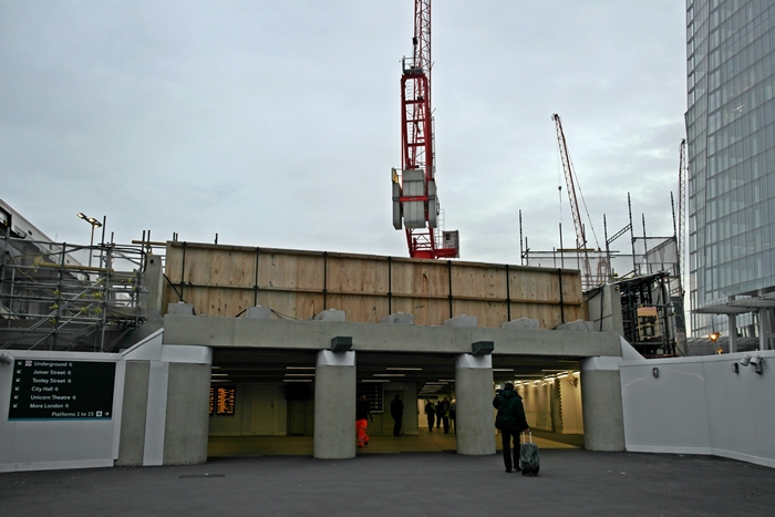 A south easterly view shows the new bus station and the overhang of the ''Baby Shard'' on the right. Going overhead, to the left, is the existing viaduct carrying the Charing Cross lines, whilst in the centre is one of the supports for the new structure. © David Glasspool