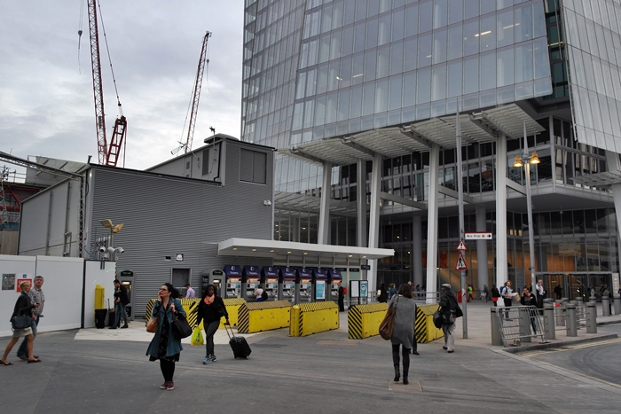 The entrance to the office section of ''The Shard'' can be seen on the far right. The large grey box structure is part of the temporary ticket office. © David Glasspool