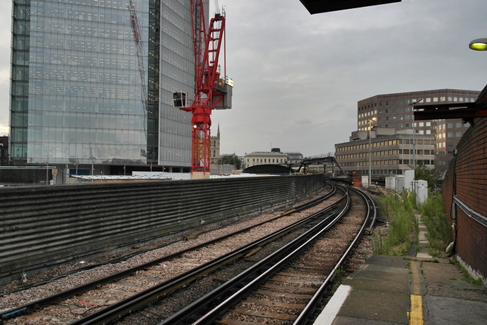 A view towards Borough Market from the end of platform 6 shows the passing loop merging before reaching the viaduct. Offices of the ''Baby Shard'', on the left, have been taken out on lease by ''News International''. © David Glasspool