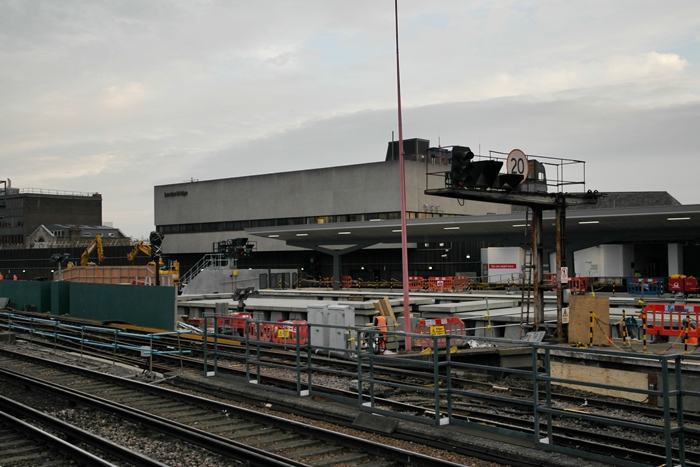 The signal box will be the only part of the 1970s station to survive the current rebuilding works. By this time, some of the new platforms had been taken to a point further south east than those of the existing ''through'' station. © David Glasspool