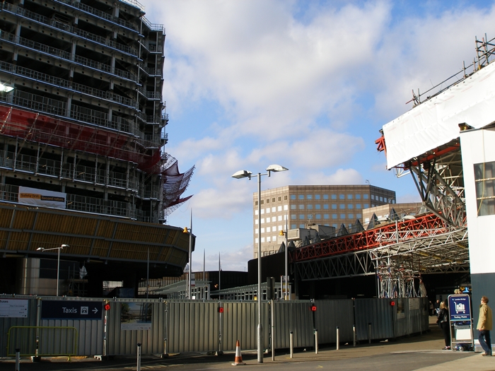 Behind the barricade in this Cannon Street-bound view is the new bus station which, like the concourse, was funded as part of the ''London Bridge Quarter'' development. This came into use on 14th May 2012. The building taking shape on the left is the ''Baby Shard''. On the right is the framework of the 1970s façade, which was in the process of demolition. © David Glasspool