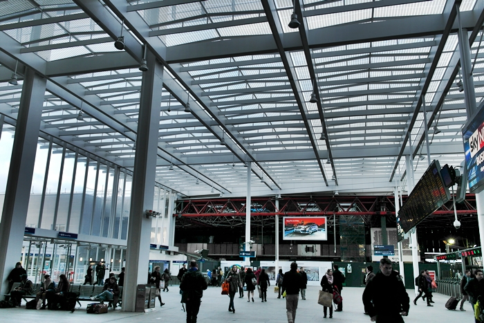A northward view shows a light and airy concourse, with the ticket barriers to the terminal platforms being on the right. In the background can still be seen the framework of the previous building. © David Glasspool