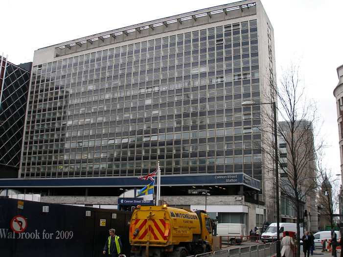 Cannon Street station's hotel was very similar in style to that now seen at Charing Cross, if not more elaborate. Also, like Charing Cross, it had a forecourt. Gutted in a bombing raid in May 1941, the hotel was repaired, and remained until 1963, when it was bulldozed and this typical 1960s office block completed on the site. The latter itself is now due for demolition, as the station embarks on yet another redevelopment programme, and when viewed on 29th February 2008, the majority of the building was deserted and in darkness. © David Glasspool