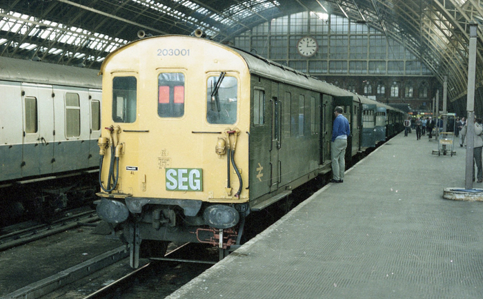 A Southern Region interloper is seen under the trainshed in the form of Hastings DEMU No. 203001. This was forming the Southern Electric Group's "Inner City Express" rail tour with Class 207 DEMU No. 207004. In addition to St Pancras, the tour visited the London termini of Waterloo, Paddington, Marylebone, Fenchurch Street, Liverpool Street, and Euston, after which it was cut short due to one of the vehicles derailing. © David Glasspool Collection
