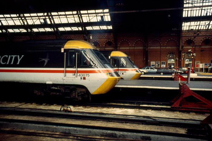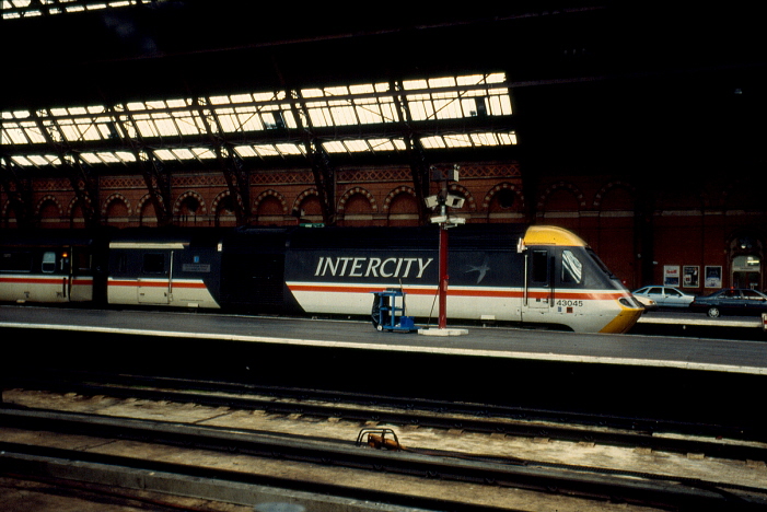 Following on from the previous view, No. 43075 has now departed, revealing a nameplate on No. 43045. This power car was at one time called "The Grammar School Doncaster AD1350" but the nameplates were removed during the locomotive's repaint into the first generation privatised livery of "Midland Mainline". © David Glasspool Collection