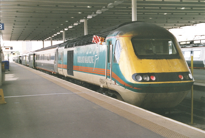 Platform 8 was open by the time No. 43054 was observed at the buffer stops on 10th April 2005. It was also a time of change for the HST fleet, with power cars receiving revised light clusters and new liveries, some even new engines. As far as the Midland main line was concerned, a trend was in full swing to replace these popular formations with DMUs. © David Glasspool