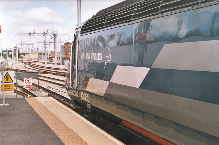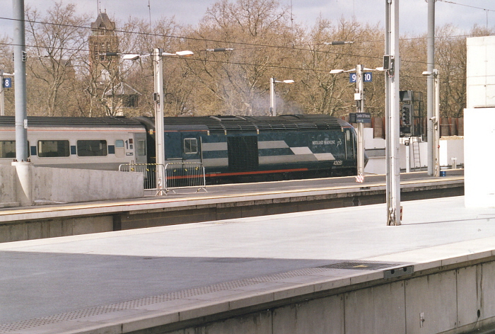 No. 43051 finally sets off for the Midlands. What the interim station has acquired, conforming with other London termini, are the blue-backed station name boards (which first appeared at London termini during 2000). However, no logo had yet been assigned. © David Glasspool